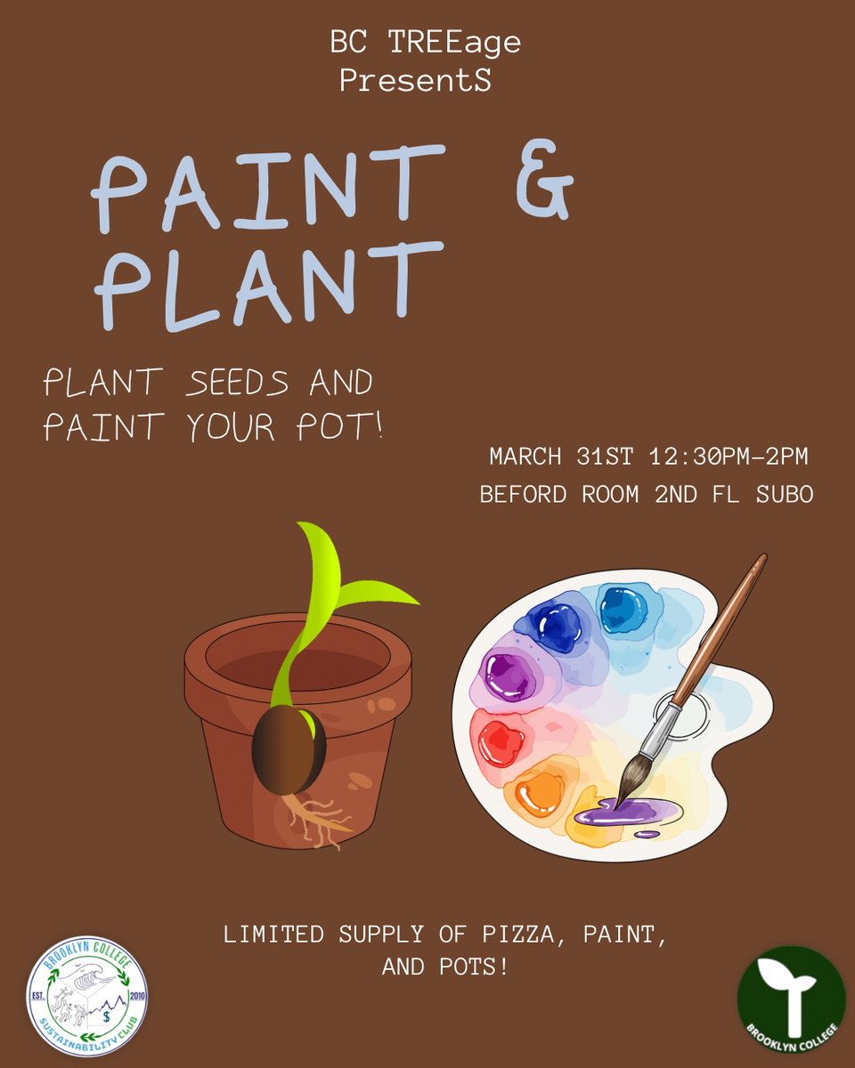 Brooklyn College students!! Join the BC TREEage Club to eat, craft, and socialize at our Paint and Plant event! All materials provided, just bring yourself and/or a friend or two! Cosponsored by the Urban Sustainability Club 🌱